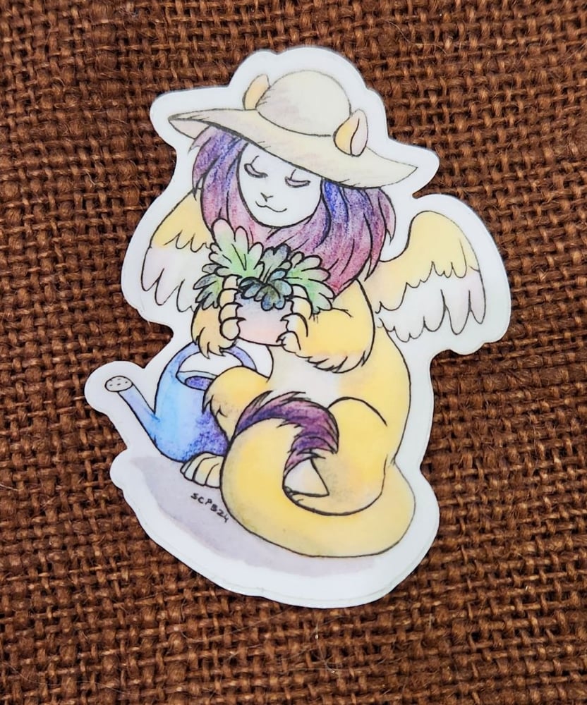 These heavy duty vinyl stickers are suitable for a variety of uses, from laptop to water bottle decor. Each sticker is roughly 2-3" at the longest side. Guest designs include the gardening sphinx by Bitty Things, and manticore by Portly Possum.